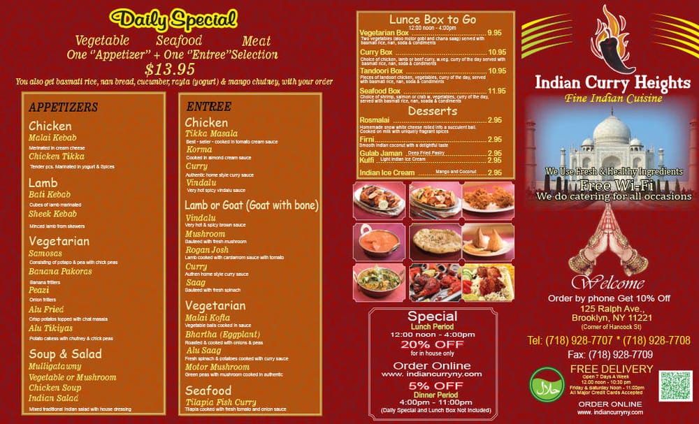 Indian Curry Heights is a classy yet casual Indian restaurant located in Brooklyn, NY. They offer a variety of vegan and vegetarian options, making it a great choice for those with dietary restrictions. Customers rave about the flavorful dishes, with favorites like chicken curry, Chana masala, lamb korma, and butter chicken receiving high praise. The lunch specials and Prix-Fix menu are also popular choices, offering great value for delicious meals. The cozy and quiet ambiance, impeccable service, and generous portions make Indian Curry Heights a go-to spot for authentic Indian cuisine. With options for both dine-in and takeout, this restaurant is a must-visit for anyone craving flavorful and well-seasoned Indian food.